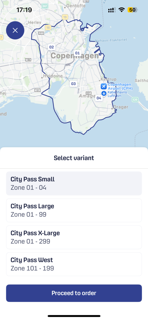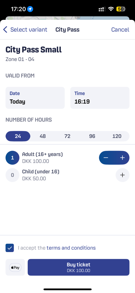 - 單程票(Single Ticket):單程票是根據區域(Zone)來計算價格。哥本哈根市中心屬於1區,大部分主要景點都在這個區域內。如果你只乘搭一兩次交通工具,買單程票即可。可以在車站的自動售票機購買,也可以用哥本哈根交通App「DOT Tickets」購買,後者更方便,還可以省去找零錢的麻煩。